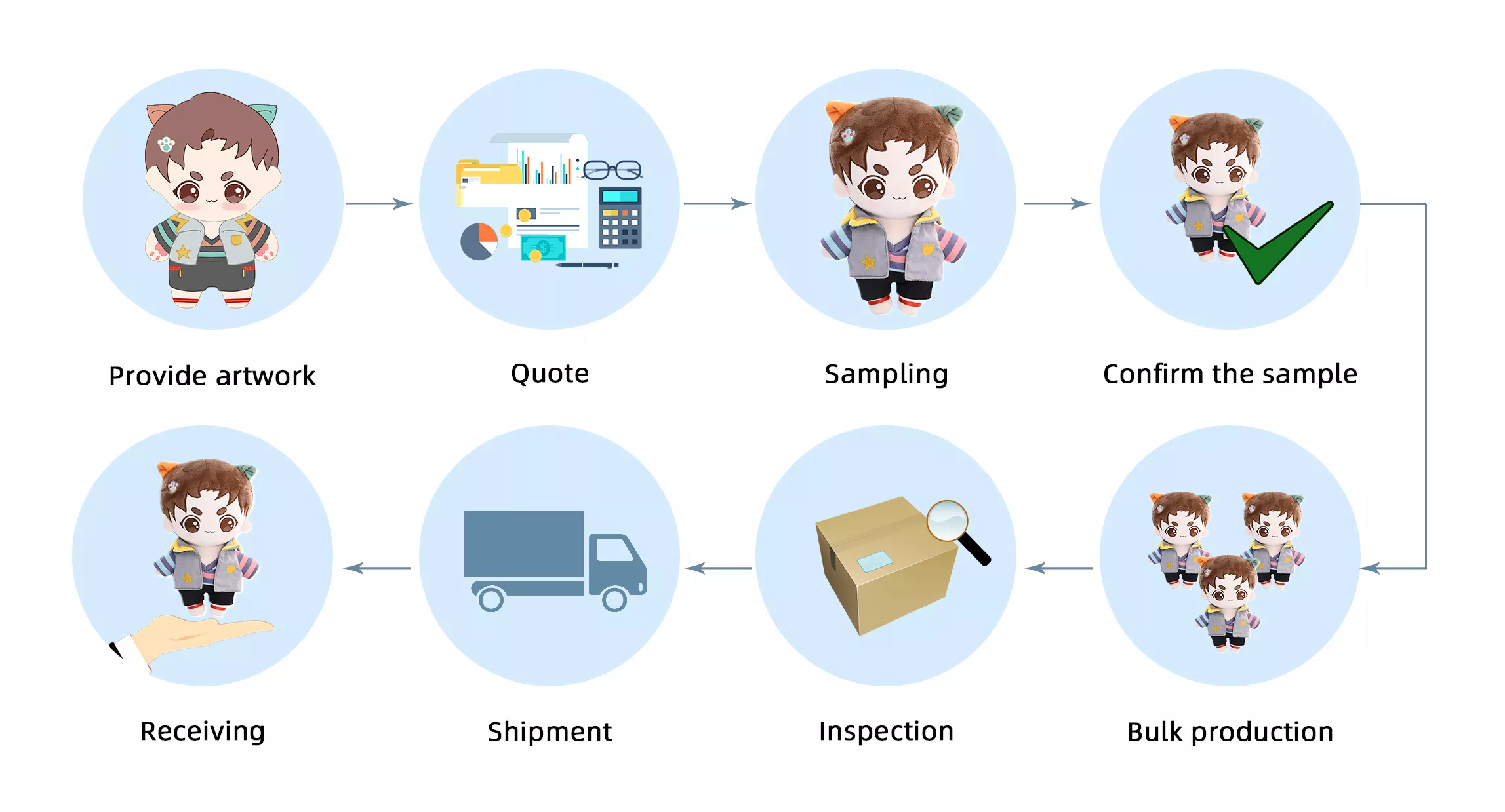 Whether you are trying to custom a plush for the first time or need professional mass production, our team will assist you all the time from providing the design to the delivery of the finished products.
