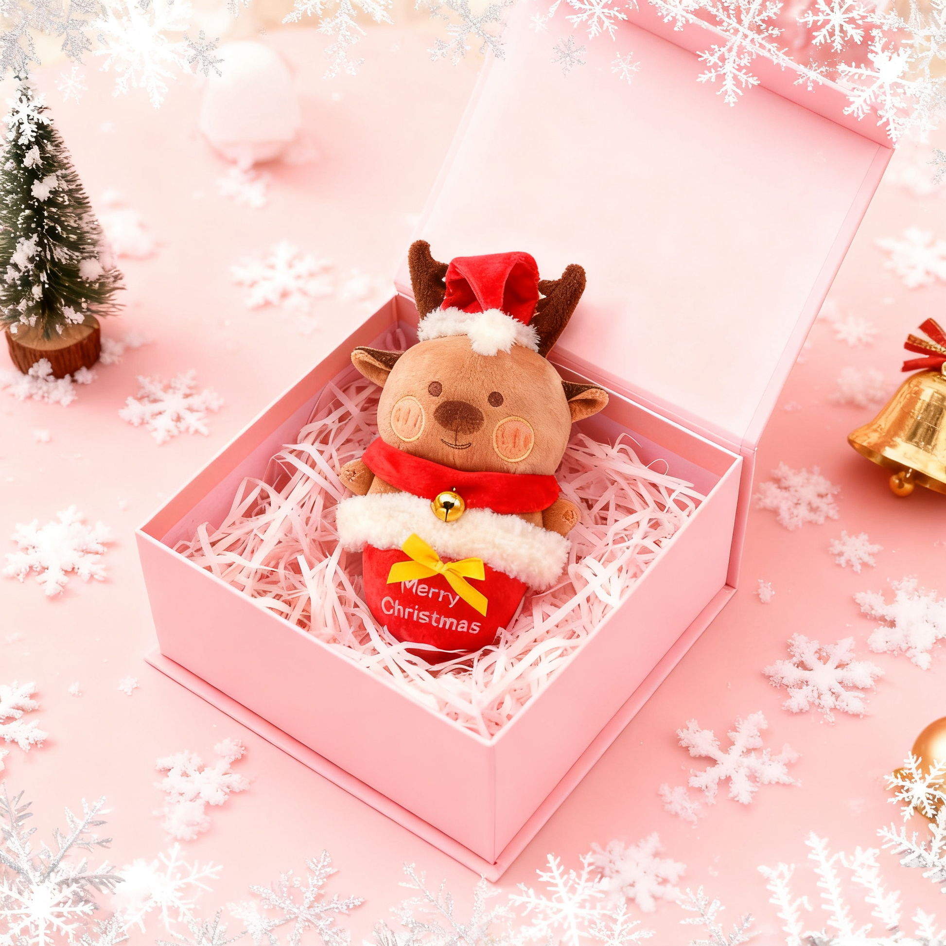 🎄 Festive Reindeer Design – Dressed in a red Santa suit with a Christmas hat, a cute bell, and “Merry Christmas” text printed on the outfit. Embroidered eyes and nose ensure safe, worry-free play.