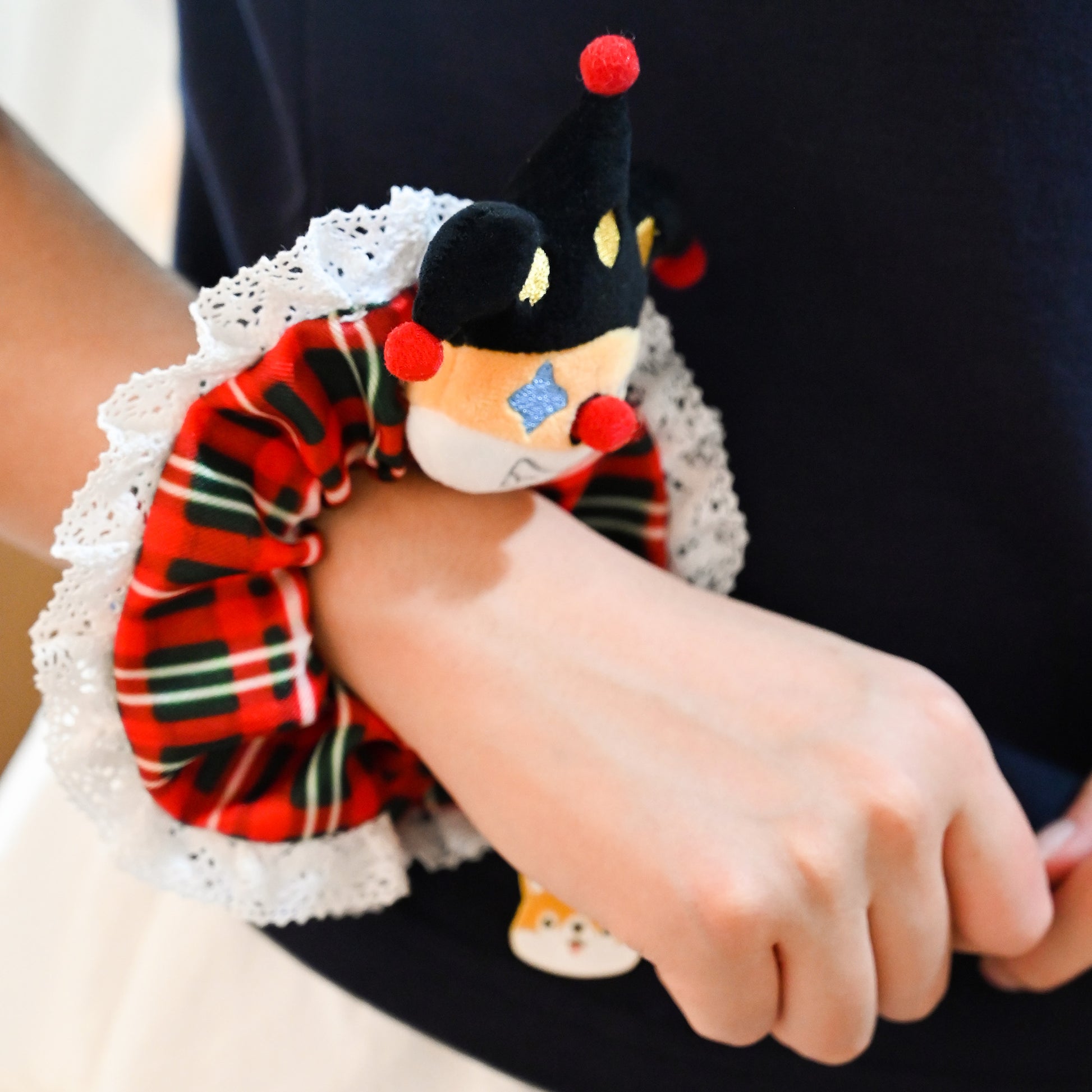 - Design: Red/green checkered + lace + clown corgi plush + metal charm