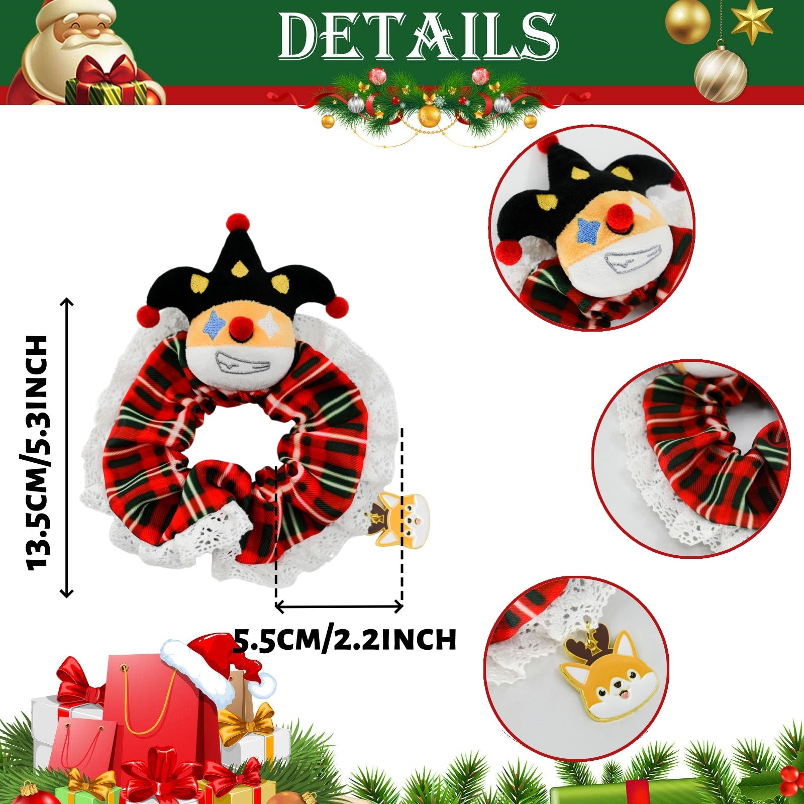 🎄 Festive Clown Corgi Design – Each scrunchie showcases a playful clown corgi plush charm (3.74"×3.35") paired with a metallic corgi pendant (0.98"×1.18"), set against a classic red and green checkered background with lace trim for a truly Christmas-themed look.