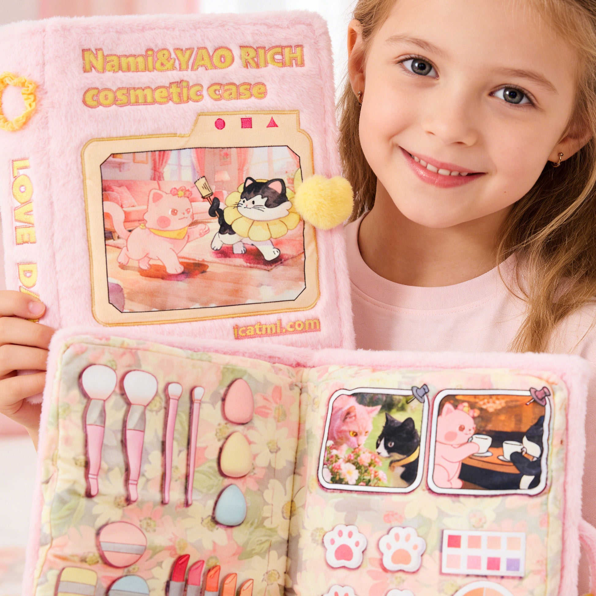 Spark your child's imagination with the Nami&YAO Rich Cosmetic Case. This beautifully crafted pink plush book opens up into a full "makeup studio" filled with adorable cat-themed illustrations and interactive soft-play elements. It is the perfect blend of a cozy plush toy and an engaging activity book.