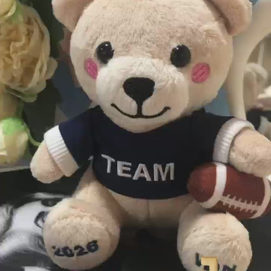 - 🏈 Authentic Sporty Design: Features a navy blue jersey with "TEAM" printed on the chest and a detailed plush football tucked under its arm.